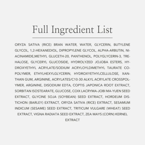 ماء، خلاصة أرز، بيوتيلين جليكول، أربوتين، جليسرين، نياسيناميد، 1,2-هيكسانيديول، بانثينول، خلاصة جذور عرق السوس، خلاصة أوراق شجرة الشاي، … (تم استكمال قائمة المكونات من موقع الشركة)