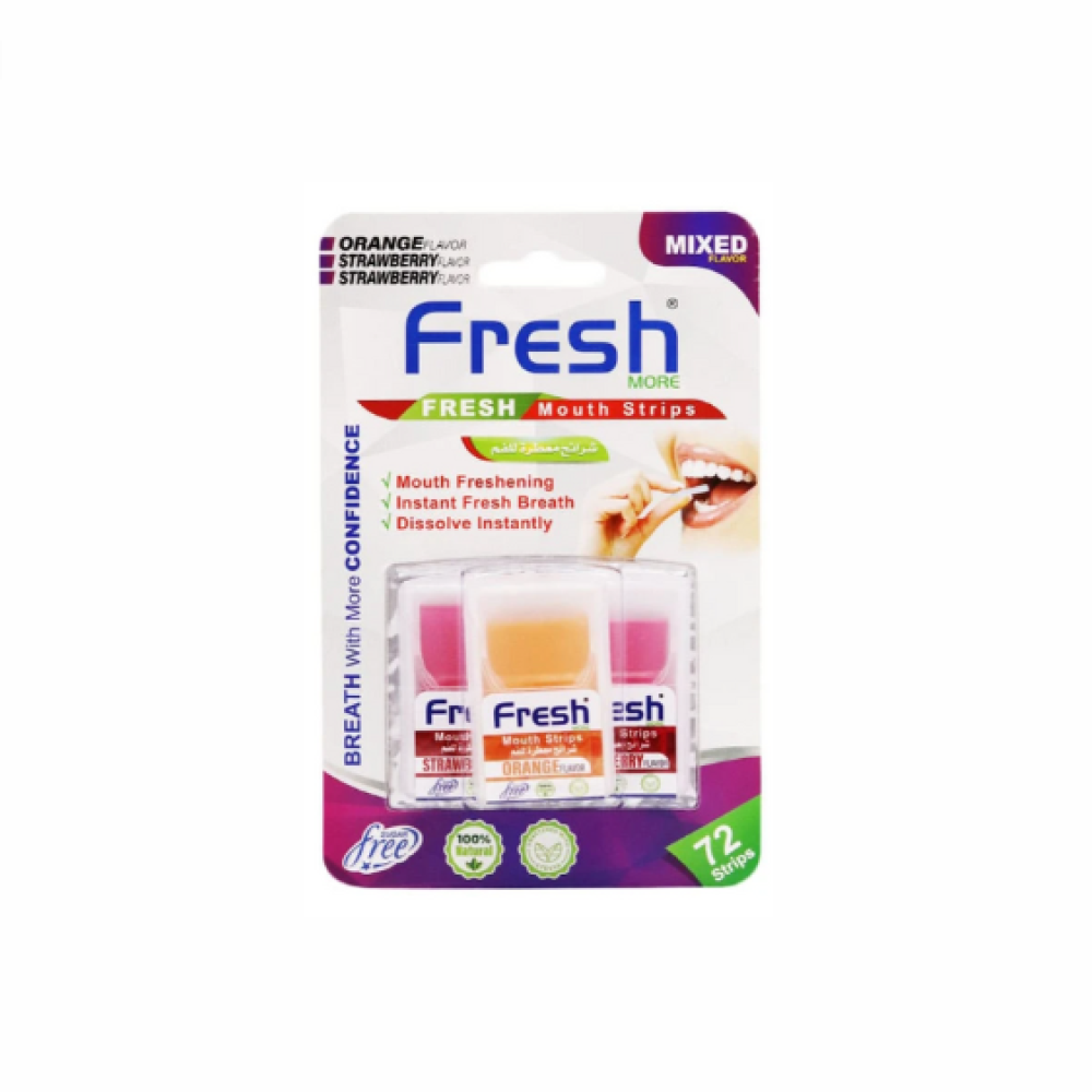 فريش مور شرائح معطرة للفم بنكهة الفراولة والبرتقال – 72 شريحة هي منتج مبتكر لتنظيف وتنشيط الفم بنكهة الفراولة والبرتقال المنعشة. تأتي في شكل شرائح معطرة توفر لك راحة ونظافة فورية في أي مكان وزمان دون الحاجة إلى ماء أو فرشاة الأسنان.